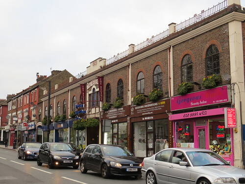 And a former healthy chicken restaurant, has been lost, as well!. Fire station. Built 1905 by A S Taylor and R Jemmett. English bond red brick with Portland stone bands and dressings; hipped Welsh slate roof; brick stack with moulded stone cap. Edwardian Baroque style. 2 storeys and attic; 2-window range. Half-glazed panelled double doors set in square-headed rusticated architraves with pronounced Keystones. Segmental open pediments and pulvinated friezes over tripartite sashes with glazing bars and balustraded aprons; similar tripartite sashes to attic storey, beneath modillioned cornice; original rainwater heads with modillioned cornices and ball pendants. One of 3 municipal buildings, originally interlinked by iron gateways, built by A S Taylor and R Jemmett for Tottenham Borough Council. (The Builder, April 14 1904).