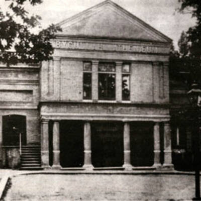 There is a mosaic panel of the BYCULLAH ATHAENEUM in the forecourt. This was a performance space, destroyed by a fire in 1931. Its name?: a district of MUAMBAY.