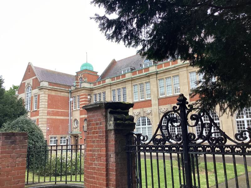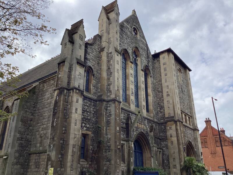 The former Charles Lamb Institute of 1908 is faced with stone in the style of a Tudor college. It was originally the parish hall for All Saints Church.